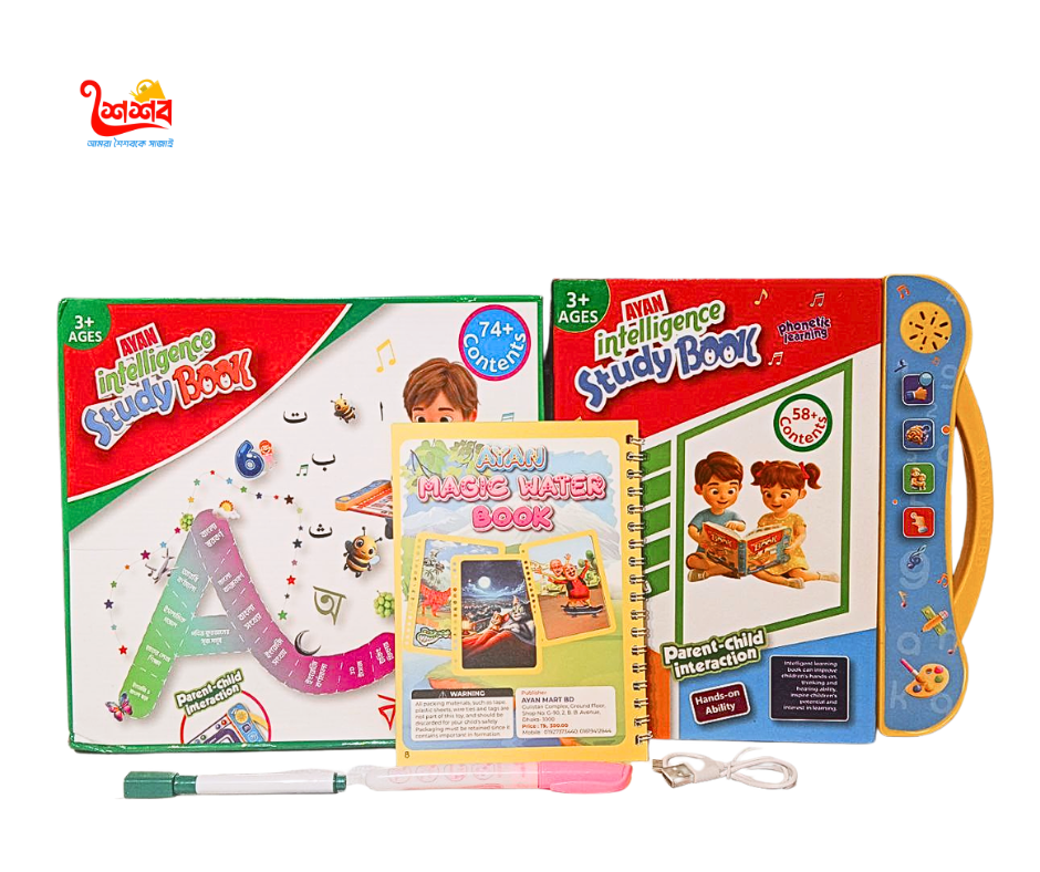 ১ টি ইন্টেলিজেন্স বুক,১ টি মারকার,১ টি ওয়াটার পেন,১ টি ওয়াটার বুক,১ টি চারজিং ক্যাবল,১ টি এলসিডি ট্যাব , ১ টি ম্যাগনেটিক পেন,১০ টি কালার ফ্ল্যাশ কার্ড,২০ টি বডি পার্টস ফ্ল্যাশ কার্ড, ২০ পশু পাখি ফ্ল্যাড কার্ড,১ টি ও্যারেন্টি কার্ড, ২ টি লটারি কুপন।